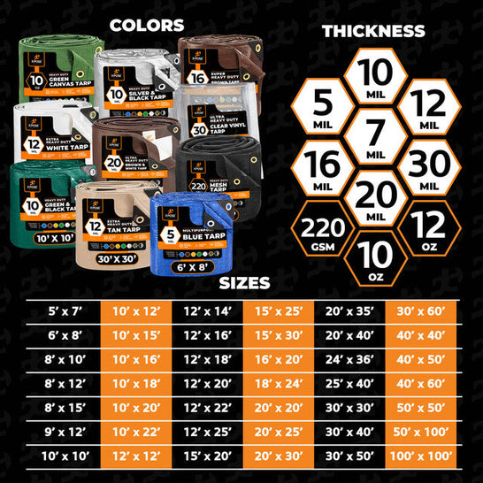 tarps are made with the highest quality polyethylene, which is a form of plastic that is extremely strong and heavy duty. It is lightweight yet durable simultaneously which is an excellent quality - 12 mil thickness means it is crafted to be extremely durable. Works amazingly well in the outdoors - backyards, gardens, patios, lawns, roofs, construction sites and more! Keep your vehicles, benches, tables, grills, and other belongings safe from harsh weather conditions when heavy rain and blizzards come around. grommets on the edges every 18 inches so you can easily tie it down on a surface.